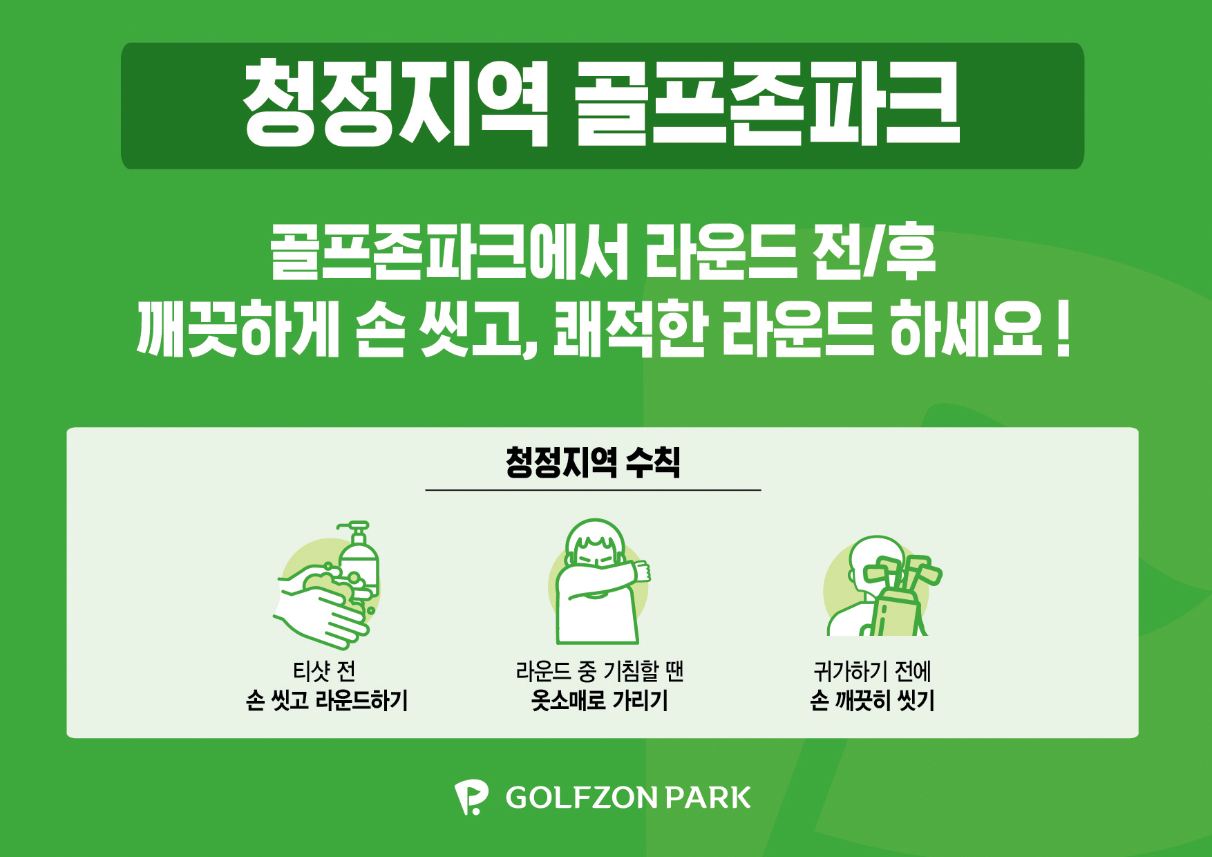 방역과 함께 고객 여러분께서도 코로나19의 감염 및 확산 예방을 위해 라운드 전/후 깨끗하게 손씻고 쾌적한 라운드를 즐기기 위해 부탁드립니다.