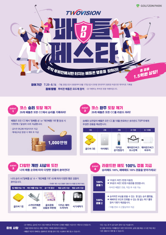 이외에도 ‘배틀존’ 승과 1위 횟수를 합산한 별도 순위에 따라 △골드바 1돈 △스카티카메론 퍼터 △골프문화 상품권 30만 원 등의 다양한 경품을 제공하는 ‘개인 시상 이벤트’와 라운드만 완료해도 경품을 100% 지급하는 이벤트 등을 통해 푸짐한 혜택을 만나볼 수 있습니다.