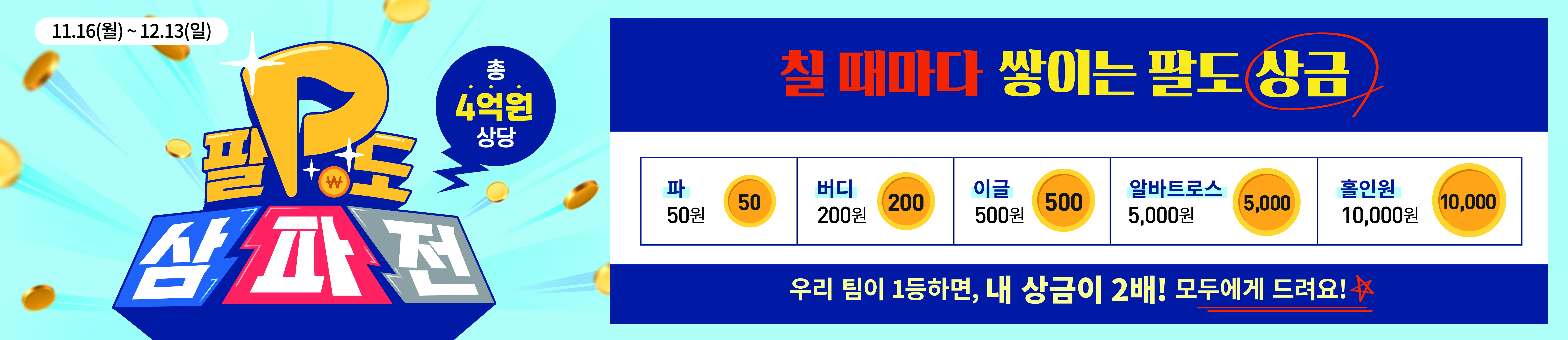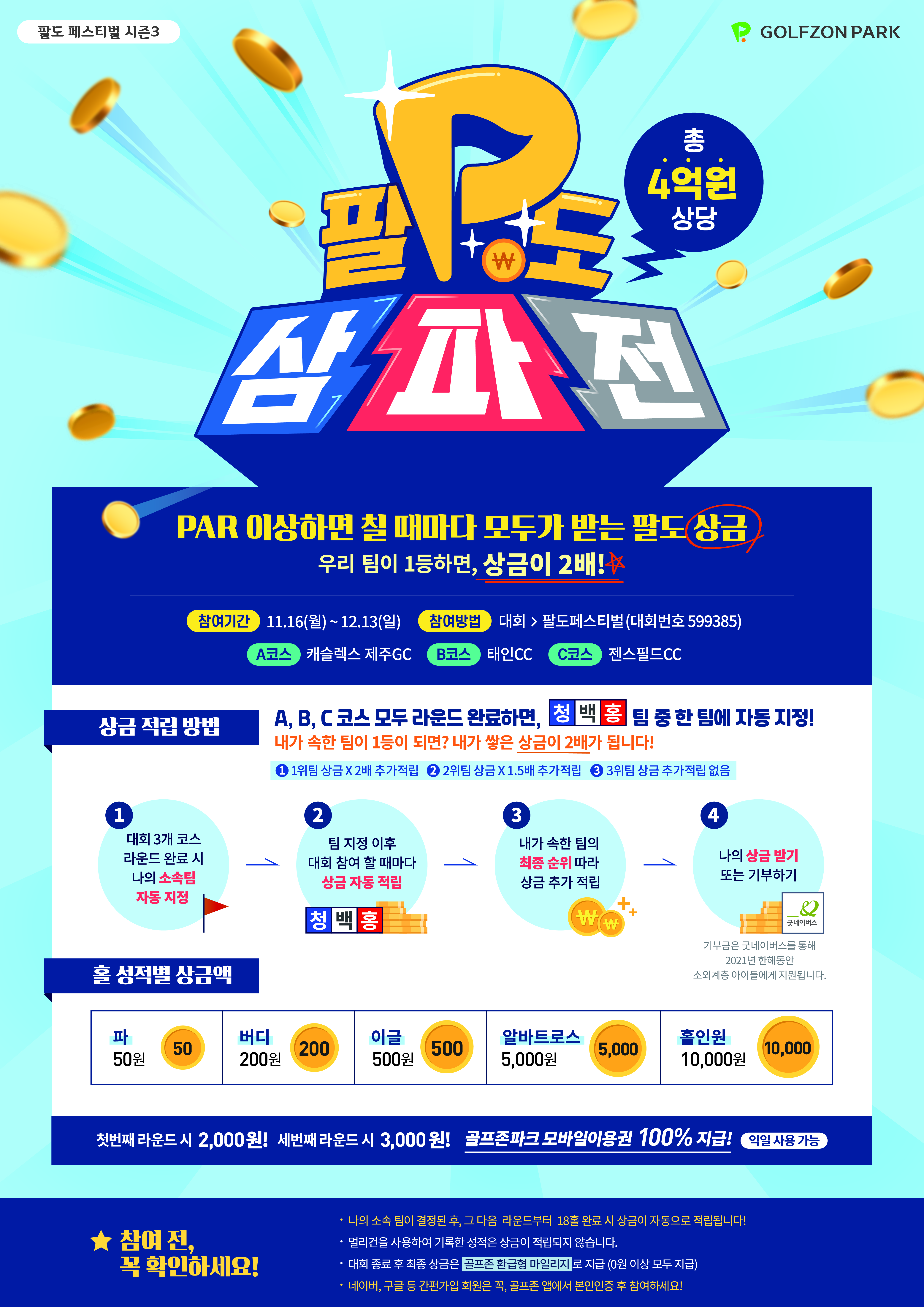 이벤트 참여 시 매 라운드의 홀 성적에 따라 상금이 자동 적립돼 누구나 쉽게 상금을 쌓을 수 있고, 적립된 상금으로 대회 종료 후 누적 상금액 1위와 2위를 기록한 팀에게는 각각 대회를 통해 획득한 상금은 물론 누적 상금의 2배와 1.5배의 상금이 추가 지급되는 만큼 치열한 도전이 예상됩니다.