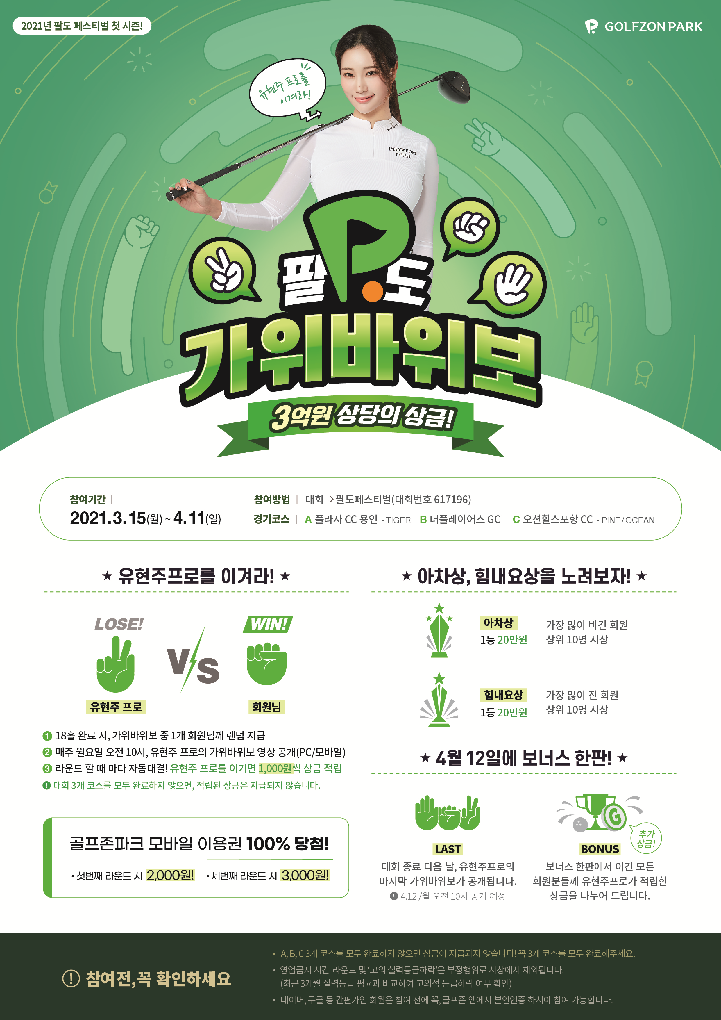 3월 15일부터 4월 11일까지 전국 골프존파크 매장에서 골프존 회원들을 대상으로 총 3억 원 상당 시상 규모의 2021 팔도페스티벌시즌1 ‘팔도 가위바위보’를 개최합니다.