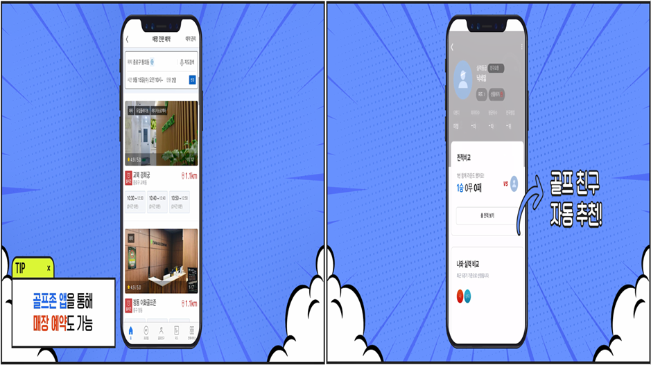 그 뿐 아니라 핸드폰 주소록을 기반으로 골프친구를 자동 추천해주어 더 많은 골프 친구들과