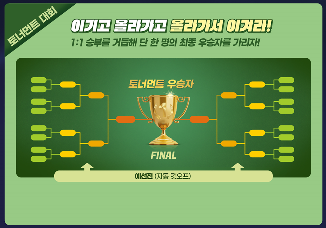 토너먼트 대회는 누구나 참여 가능한 예선전을 통해 예선 성적으로 본선 진출자가 자동 컷오프 되어 본선에 진출하는 방식 입니다. 본선부터 1:1 승부를 거듭해 단 한 명의 최종 우승자를 가리는 대회로 대진표가 자동 제공 됩니다.