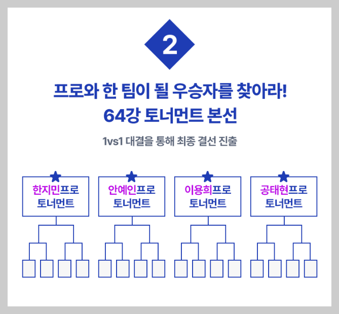 내가 좋아하는 프로들의 64강 토너먼트에 참여해서 실력도 뽐내고 한팀이 되어 우승상금에 도전하는 기회 입니다!