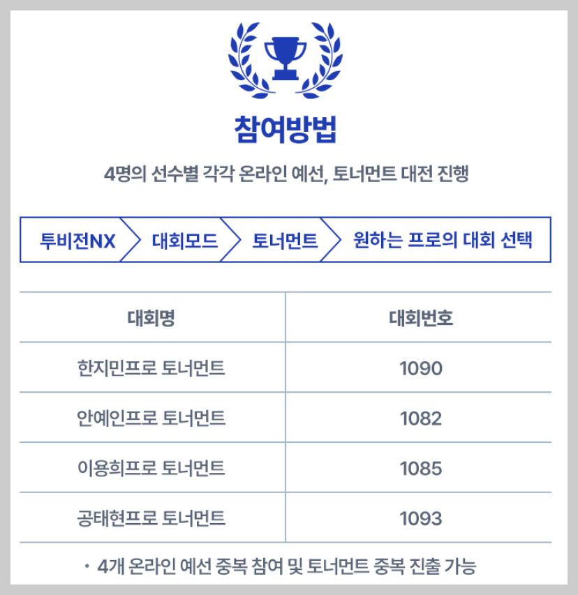 한 명을 고르기 어렵다면? 물론, 모든 선수의 대회에 중복 참여도 가능하니!