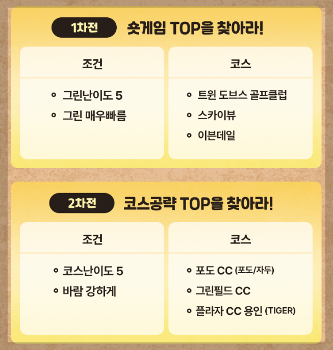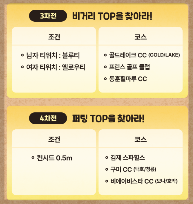 1~4차전은 각 숏게임, 코스공략, 비거리, 퍼팅 TOP랭커를 찾는 대회로