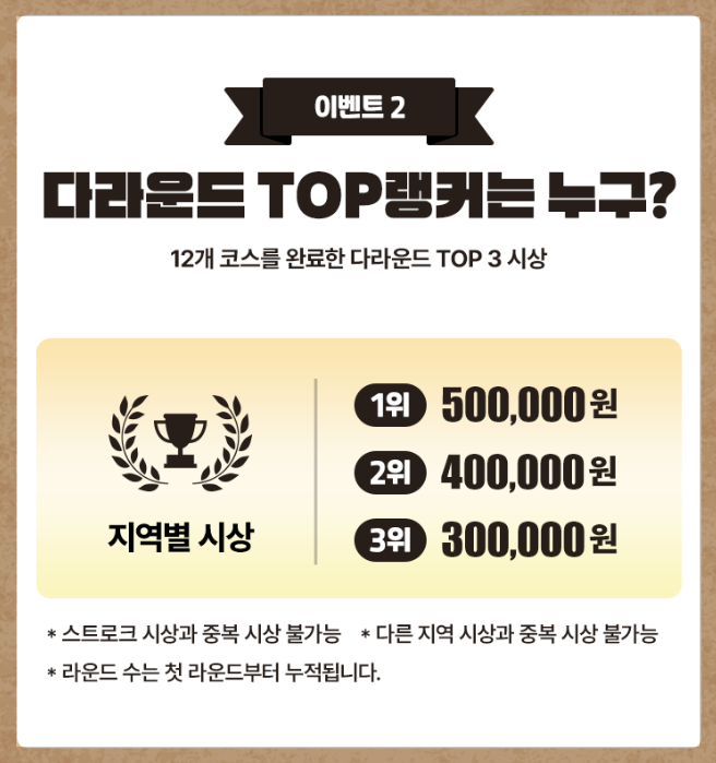 12개 코스를 완료한 스트로크, 다라운드 TOP3를 지역별 시상하며 각각 백만원부터 골프존 마일리지를 순차 지급합니다