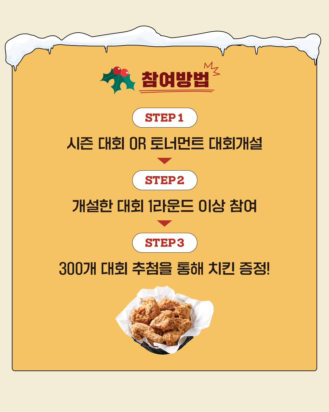 12월 1일부터 12월 31일까지 한 달간 시즌 대회 및 토너먼트 대회 개설 이벤트인 ' '대회 만들고 모이면, 골프존이 치킨 쏜닭!'을 진행합니다.