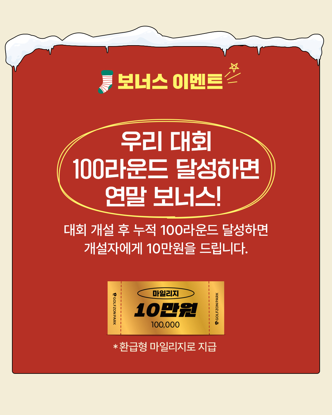 연말을 맞아 보너스 이벤트도 진행합니다. 시즌 또는 토너먼트 대회 개설 후 누적 100라운드 이상을 달성한 대회의 개설자에게는 10만원을 골프존 환급형 마일리지로 선물합니다.