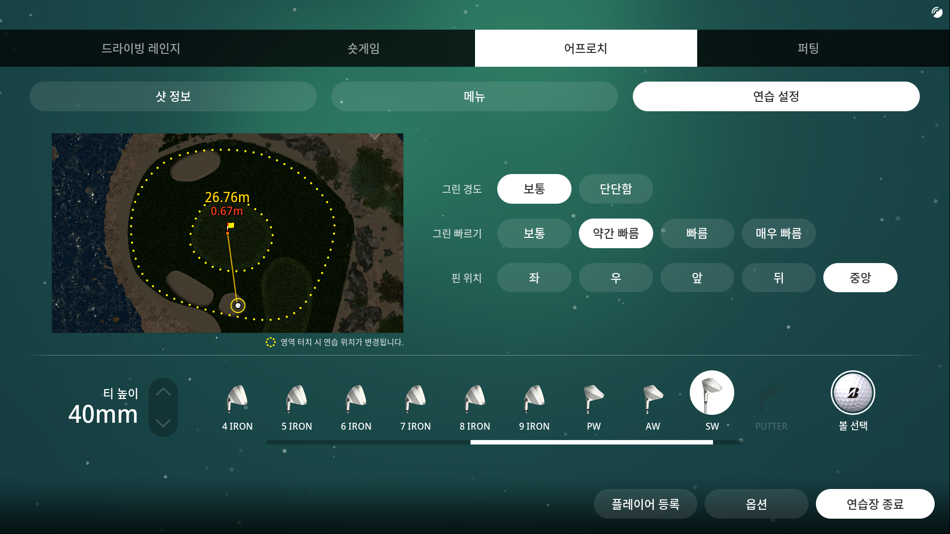 어프로치 연습장은 그린 주변 어디에서든! 터치모니터 터치 한 번으로, 페이웨이, 러프, 벙커 어디에서든! 그린 빠르기, 그린의 경도, 핀 위치를 자유롭게 설정하여 연습이 가능합니다.