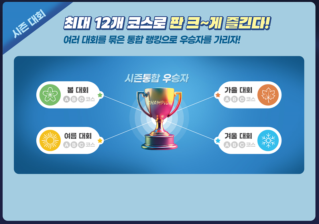 각 차전별 대회 코스 및 경기 조건을 다르게 만들어 동시에 진행한다면 다양한 코스를 한 번에 즐길 수 있게 되고 순차적으로 진행한다면 기간 동안 꾸준히 참여하는 대회로 진행할 수 있습니다.