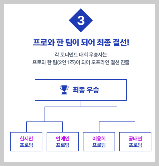 내가 좋아하는 프로들의 64강 토너먼트에 참여해서 실력도 뽐내고 한팀이 되어 우승상금에 도전하는 기회 입니다!